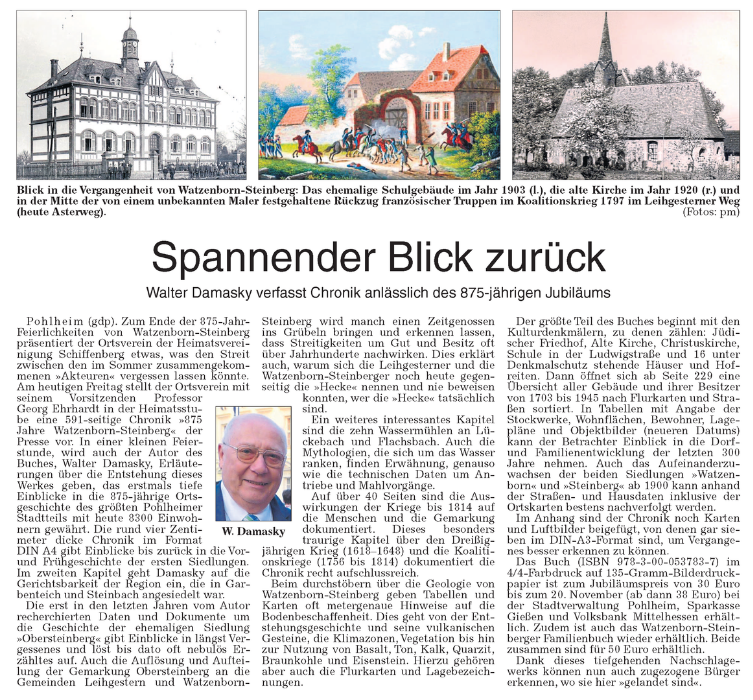 Bericht in der Gießener Allgemeinen Zeitung vom 30.09.2016 über die Entstehung der Chronik 875 Jahre Watzenborn-Steinberg und den Autoren Walter Damastky
